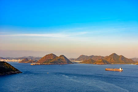 Cargo ship arriving at the entrance of the Guanabara Bay in Rio de Janeiro with Niteroi city in background