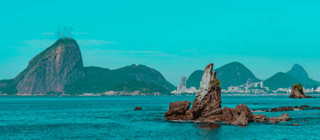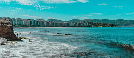 Rio de Janeiro, Brazil - CIRCA 2021: Coastal region of ocean beach during the day with sea, sand and rocks