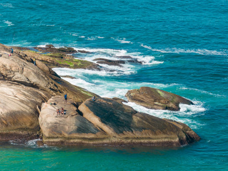 Aerial view of Pedra do Arpoador and fisherman. Rio de Janeiro. Brazil