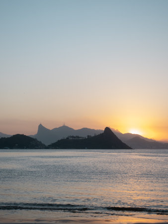 A breathtaking sunset over the ocean and the silhouette of the statue of Christ the Redeemer in Rio de Janeiro