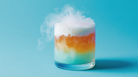 A clear glass holds a vibrant, layered drink with colors ranging from blue to orange, topped with a swirling cloud of mist. This artistic beverage creates a stunning visual appeal.