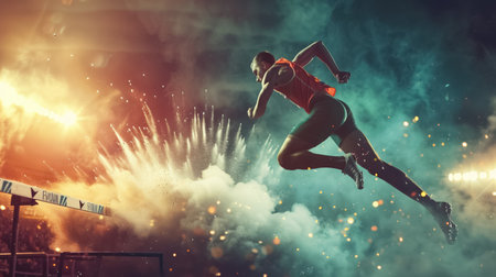 athlete man running and jumping at championship, run and jumps sport concept, olympic games. High quality photo