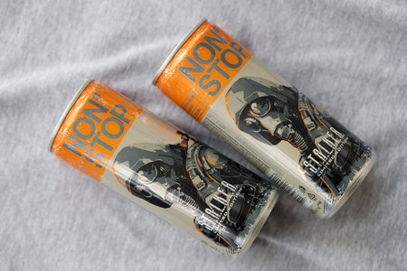 KYIV, UKRAINE - OCTOBER 31, 2023 Non Stop energy drink with limited edition design of Stalker and character with gas mask on aluminium tin can close up