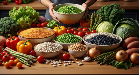 Abundant display of fresh vegetables and legumes including peas, lentils, beans, bell peppers, tomatoes, broccoli, and leafy greens on a wooden table. A woman hands hold a bowl of green peas, emphasizing healthy eating and plant based nutrition.