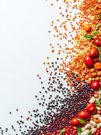 An artistic composition of various beans, lentils, and seeds is arranged in a colorful pattern on a clean surface.