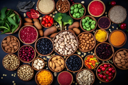 Health food selection with vegetables, fruits, herbs, pulses, seeds and nuts. health concept. Generative AI