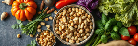 Fresh vegetables and peanuts arranged on a dark countertop for a healthy meal preparation in a kitchen setting