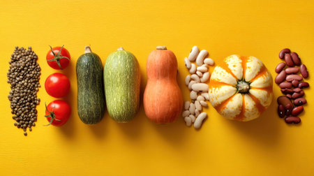 Colorful arrangement of vegetables and legumes on yellow background.