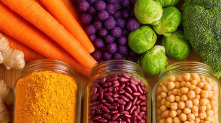 A vibrant arrangement of fresh vegetables and spices in jars showcases a healthy variety for cooking. Perfect for nutrition-focused recipes and meal preparation.