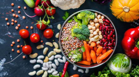 A bowl filled with vibrant vegetables and legumes sits among a variety of raw produce on a dark background, highlighting healthy eating and meal preparation.