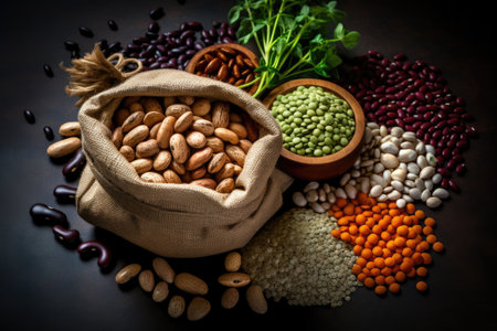 AI Generated. Assorted legumes and spices in wooden bowls on dark background