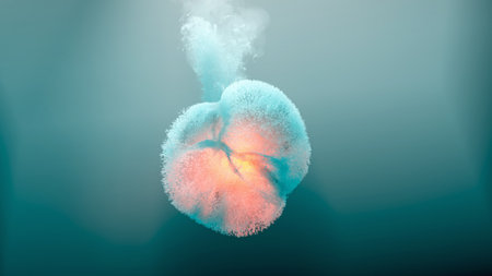 Underwater explosion with an orange light in its center with a dark gradient background and lots of tiny bubbles emitting many white bubbles particles from its top