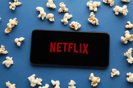 Smartphone with Netflix logo and popcorn on blue background. Netflix specializes in and provides streaming media and video-on-demand online and DVD by mail. Top view
