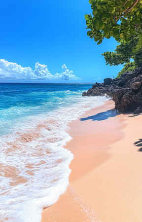 Gentle waves lap against golden sand as sunlight reflects on the turquoise water. Lush greenery adds to the tropical feel on this serene beach during a clear day.