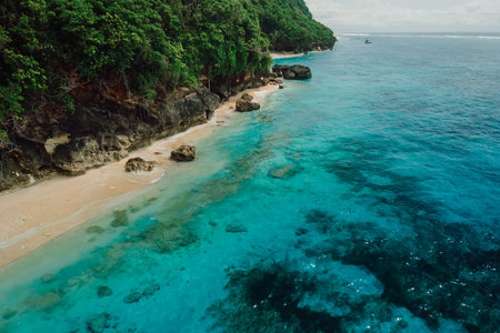 Aerial view of scenic coastline with turquoise ocean and tropical beach under rocky cliffs.
