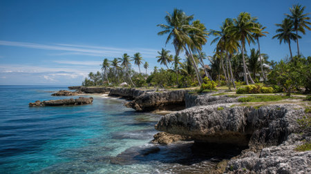 A stunning coastal view featuring lush palm trees and crystal-clear waters under a bright blue sky. Perfect for showcasing natural beauty and tropical relaxation.