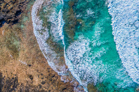 Aerial view of ocean waves crashing on the rocks in Hawaii.