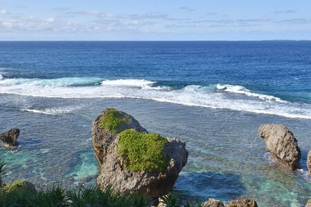 A spectacular view from the triangular point overlooking the cliffs and blue sea of Irabu Island, a remote island in Miyako Island.