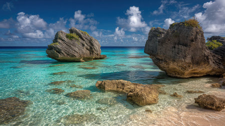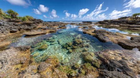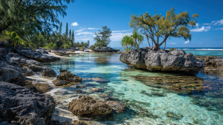 A stunning panoramic landscape of a pristine tidal pool with transparent turquoise water revealing the rocky seabed on a remote tropical island under a beautiful blue sky.