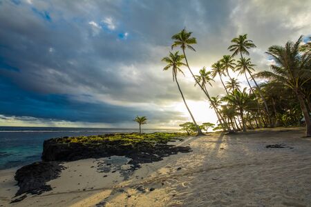 Coconut palm trees on the beach during the sunrise on Upolu, Samoa Islands.