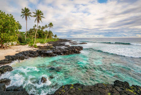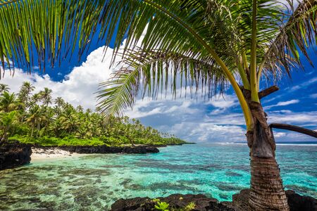Tropical beach on south side of Samoa Island with coconut palm trees.