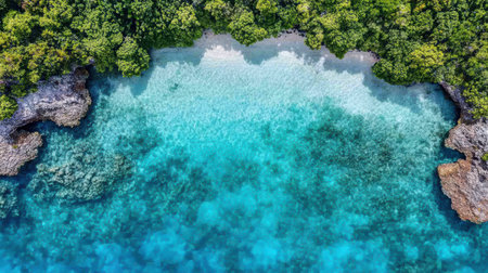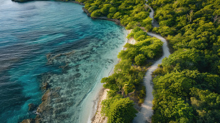An Aerial view of serene tropical beach with clear turquoise water and lush greenery
