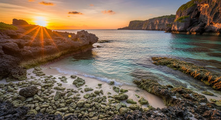 Experience a breathtaking coastal view featuring dramatic cliffs and lush greenery bathed in soft sunlight. This tranquil scene invites relaxation and exploration.