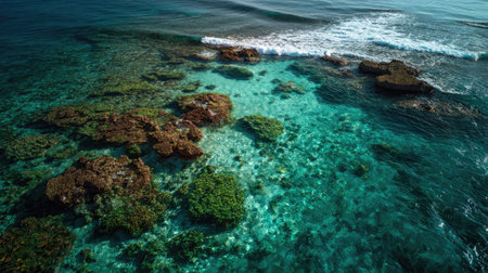 A breathtaking aerial view captures a vibrant coral reef surrounded by clear turquoise water. Rocky outcrops emerge from the sea, creating a serene tropical landscape.