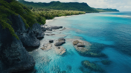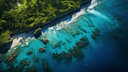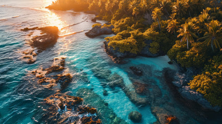 Generative AI A drone's aerial view capturing a remote island paradise enveloped in dense palm forests, with secluded bays and vibrant coral reefs along its coastline
