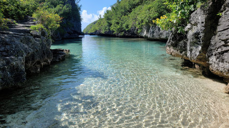 Stunning hidden beach with lush cliffs and sparkling blue waters.