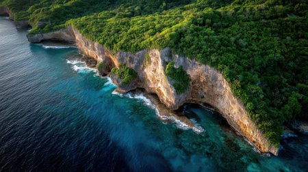 Breathtaking aerial perspective showcasing dramatic cliffs and vibrant turquoise waters against a backdrop of lush greenery, evoking tranquility and natural beauty.