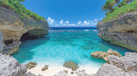 Explore this stunning coastal scene featuring vibrant turquoise waters, dramatic rock formations, and a bright blue sky, perfect for travel enthusiasts and nature lovers.
