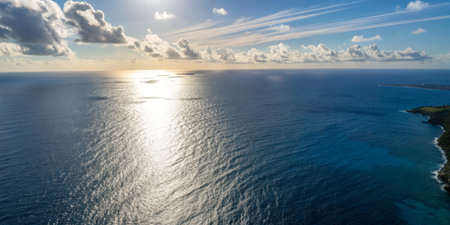 High above the tranquil ocean, sunlight dances on the water surface, creating a mesmerizing reflection. The horizon stretches far, showcasing a blend of blues and natural beauty.
