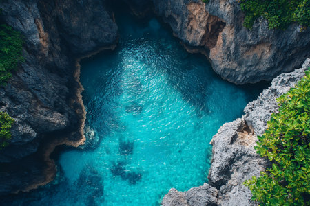 Breathtaking aerial view of crystal clear turquoise water enclosed by majestic cliffs in Nusa Penida, Indonesia, showcasing the raw beauty of nature