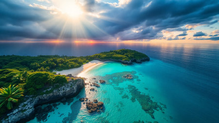 A breathtaking aerial view of a tropical island, with white sandy beaches and clear blue lagoons.