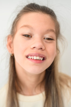 Close-up candid portrait of cute 7-8 years old girl with two funny braids taken up at the sky from the ground, happy summertime, outdoor lifestyle