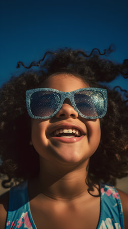 Close up portrait of a smiling african american little girl wearing sunglasses