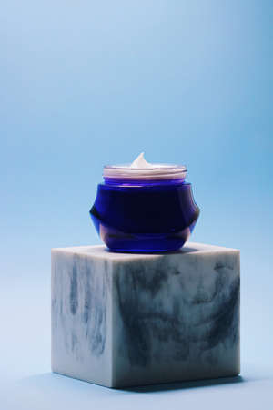 Anti-aging skincare and cosmetics, beauty face cream in jar on blue background