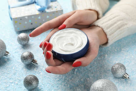 Woman holding jar of winter cream for skin, gift box on snowy blue background, space for text. Closeup