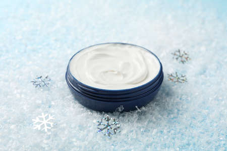 Winter cream for skin on snowy blue background, space for text. Closeup