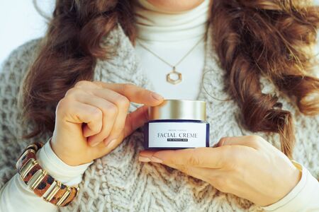 Closeup on young woman with long wavy hair in neck sweater and cardigan showing winter skin care facial creme against winter light blue background.
