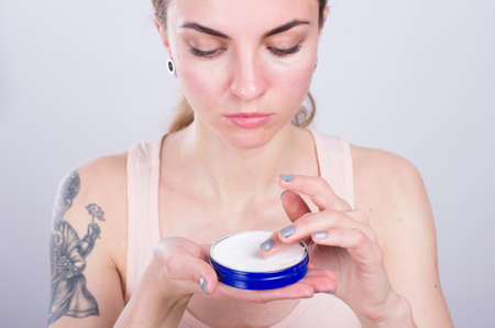 Pamper Skin. Portrait of beautiful tattooed woman with pierced nose and short hair trying skin care product, holding white plastic jar of cream or body lotion isolated over grey background