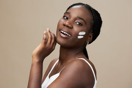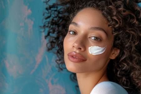 A beautiful young African American woman with curly hair showcasing a white cream on her cheek in a studio setting.