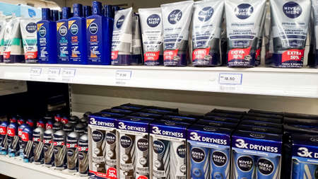 MELAKA, MALAYSIA - April 13, 2018 : Assorted brand and type man and woman care product on shelf rack display in the store.