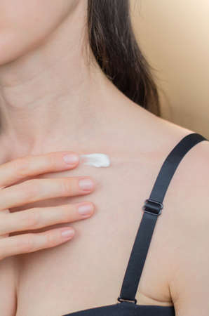 Body cream on the female collarbone. Woman applying moisturizer to body