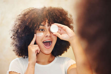 Oh wow, look at the glow. Shot of a beautiful young woman applying moisturiser to her face.