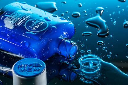 Kharkov, Ukraine - March 23, 2021: Nivea cosmetic brand logo with droplets close-up
