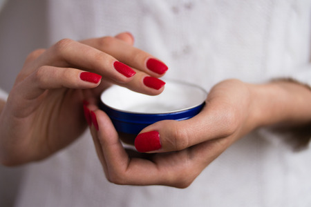 Female hands with red nails applied the cream out of the blue jar