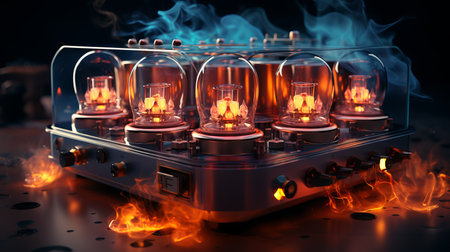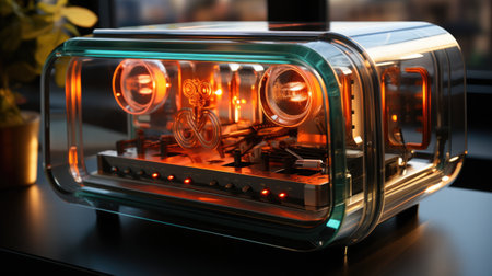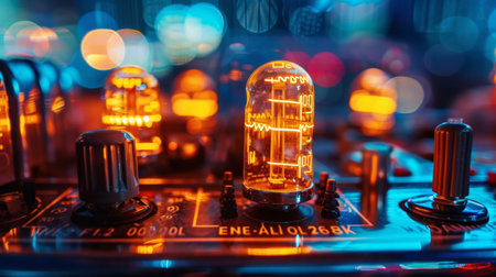 A close-up view of vintage electronic components with glowing tubes, capturing the nostalgic and technological vibe. Perfect for themes related to technology, retro, and electronics.