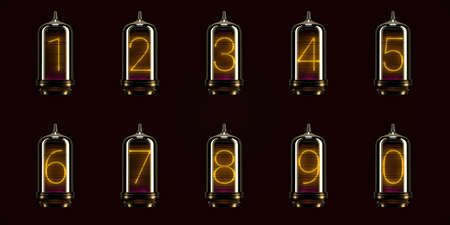 Nixie tube decimal digits. Set of real photos of very old, vintage indicator isolated on a black background.